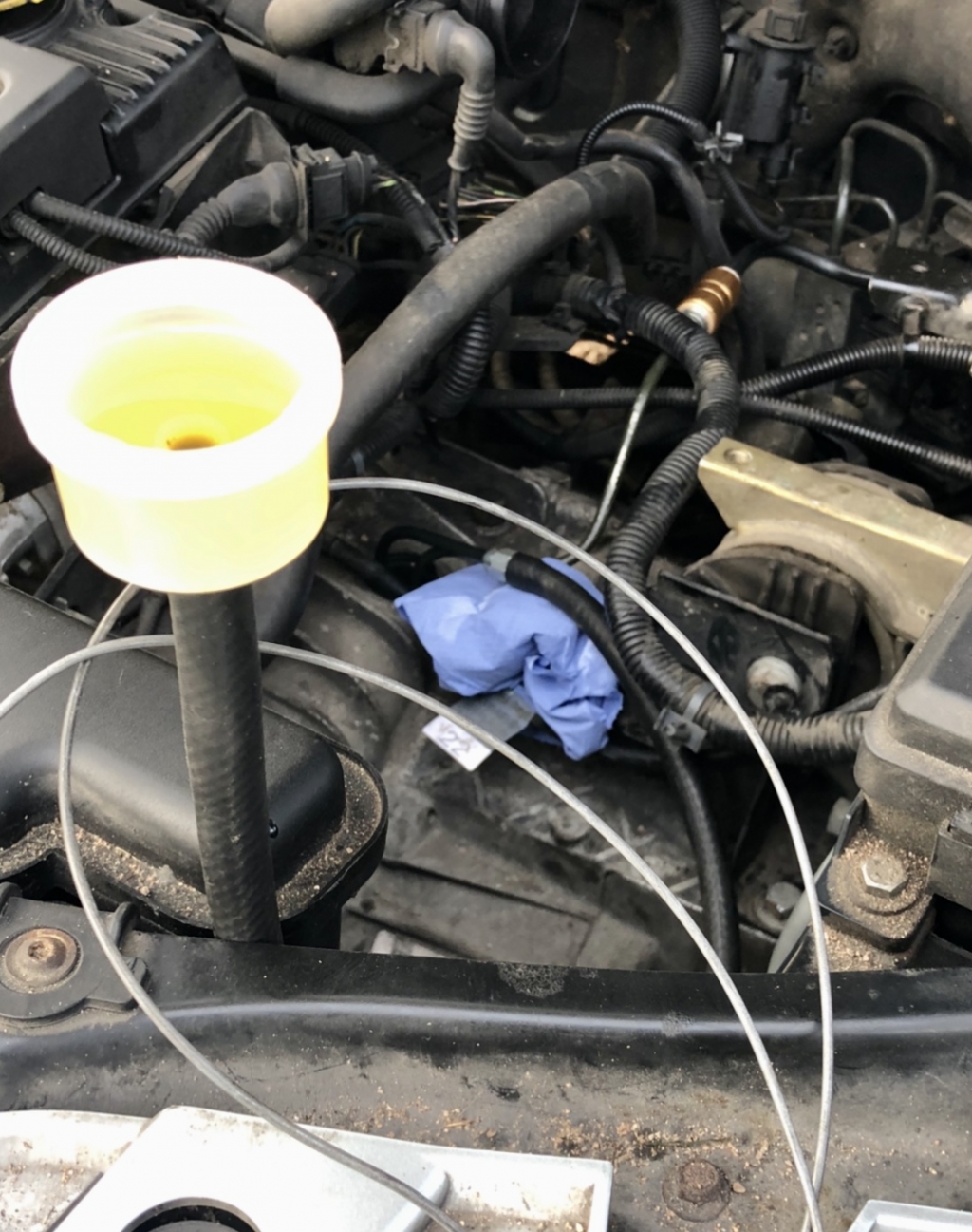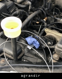 Vu que je n ai pas changé l émetteur , j ai pensé qu en remplissant un petit récipient de liquide de freins relié à la vis de purge de la butée, l air se chasserai